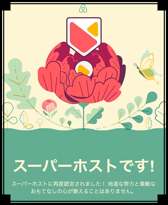 Airbnbでのスーパーホスト認定は、誠実な対応と安定した高評価の証。経験と実績をもとに、信頼される運営を行います。